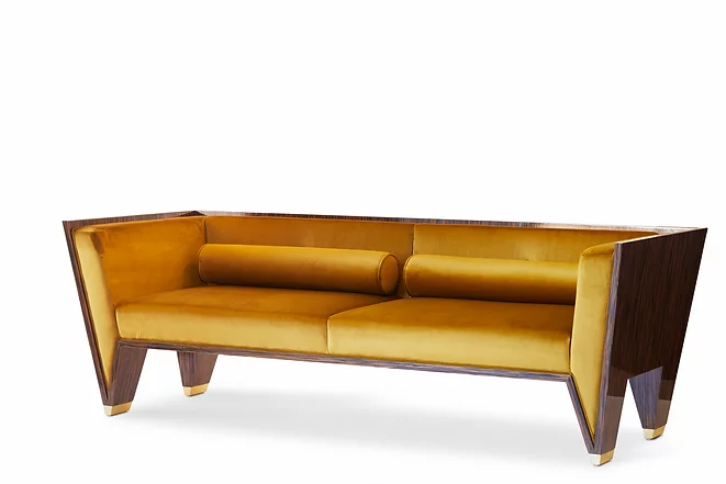 Pieds en laiton poli miroir, structure en ébène Makassara avec laque haute brillance et velours premium extra douce couleur moutarde.